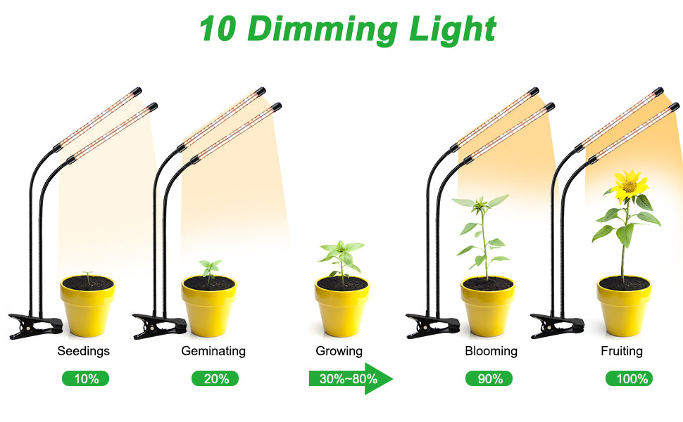 🌼【3 light modes and 10 dimming levels】The plant lamp has 3 color modes (white+warm white light, red+warm white light and mixed light) in 10 dimmable brightness levels. It can be set to 10%, 20%, 30%, 40%...80% and 100% brightness. So you can adjust the brightness and spectrum of the plant lamp to make your plants grow healthy.