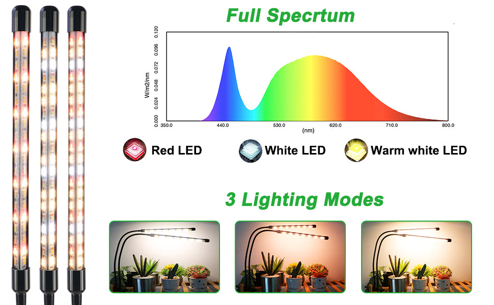 🌼【Newest full spectrum】 Niello Growing Light contains 160 pieces of LEDs (32 pieces 5000k white + 100 pieces 3000k warm white + 28 pieces 660 nm red). It emits all wavelengths from 380 nm to 800 nm - just like natural sunlight. The full spectrum is the most effective spectrum to support all stages of plant growth. Grow light promotes photosynthesis, germination, flowering and fruiting.