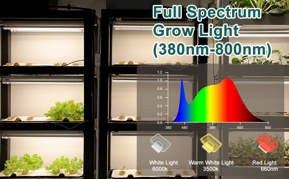 🌼【Full Spectrum Grow Lights】240pcs LEDs. Designed with 144pcs white LEDs + 72pcs warm white LEDs + 24pcs red LEDs. Wavelengths are 380nm-800nm, more scientific and energy efficient! It provides plants with all the natural sunlight they need at all stages, from growth to flowering. Achieve a higher yield and save energy costs at the same time! It is suitable for seed harvesting.
