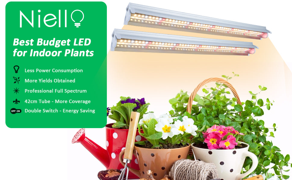 - Upgraded full-spectrum and wider lighting range: the Niello T5 plant lamp LED growth light is designed with a full spectrum of 380-800 nm, it is the professional replacement of solar light for indoor plants. In particular, red LEDs with 630 - 660 nm are added, which make the spectrum richer and more efficient, reward more flowers, and harvest. Perfect for sowing, vegetative circulation, and flowering.